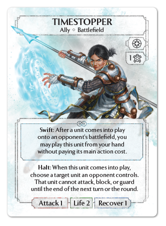 Halt your foes in time with this speedy ally. With the ability to enter play at a moment’s notice and temporarily exhaust an enemy unit, you’ll be able to get the upper hand on the battlefield in no time.